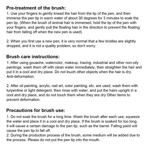 1. Po zastosowaniu gwaszu, akwareli, makijażu, kalki, obrazów przemysowych i innych nietustych należy je natychmiast zmyć czystą wodą, następnie wyprostować wosy i umieścić je w chodnym i suchym miejscu. Nie dotykaj innych przedmiotów, gdy wosy są suche. Zapobieganie deformacjom.