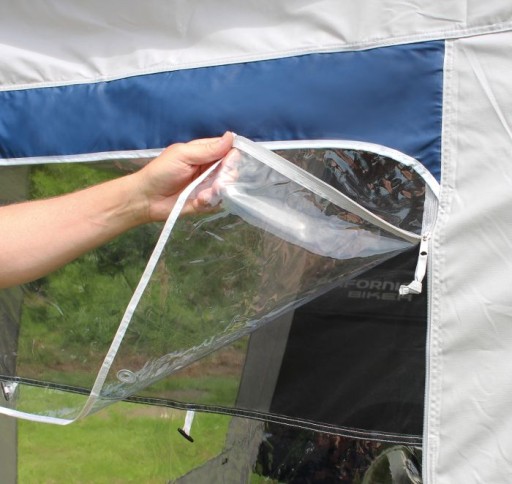 Ścianka przednia posiada duże panoramiczne okno z moskitierą i drzwiami zamykanymi na suwak