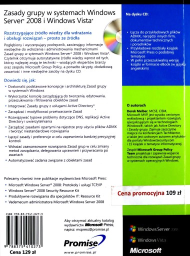 Zasady grupy w sytemach Windows Server(R) 2008 i Windows Vista(R). Czytelnik otrzymuje autorytatywne źródło wiedzy wprost od tych, którzy najlepiej znają te techniki wiodących ekspertów branży oraz zespołu Microsoft Group Policy, a ponadto skrypty, dodatkową zawartość i inne niezbędne zasoby na dysku CD.