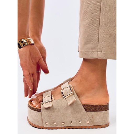 Korkowe klapki damskie na platformie. Jeśli podążasz za trendami to musisz mieć ten efektowny model w swojej kolekcji! Wysoka podeszwa (6 cm) zapewnia stabilność, a profilowana wkładka wewnętrzna wygodę na każdym kroku. Gwarantujemy, że nikt nie przejdzie obojętnie obok tych butów : ) Materiał zewnętrzny – zamsz ekologiczny (kolor czarny, fuksjowy, beżowy)/ skóra ekologiczna (kolor złoty).