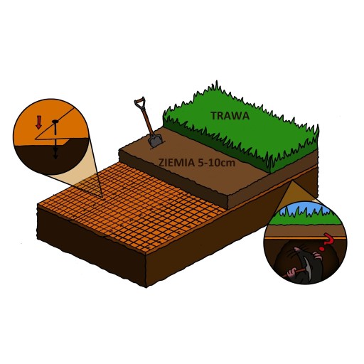 W przypadku konieczności montażu siatki na krety na istniejącym trawniku należy etapami zdejmować szpadlem wierzchnią warstwę ziemi około 10cm na głębokość i odkładać ostrożnie na bok.