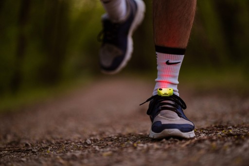 TickLess Run przytwierdza się do sznurówki obuwia - urządzenie jest stabilnie przymocowane.