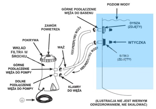 - Wszystkie niezbędne elementy są dostarczone wraz z pompą, co pozwoli Ci na szybkie i łatwe zamontowanie jej w dowolnym miejscu w pobliżu basenu.