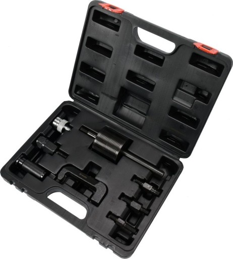 Profesjonalny zestaw do szybkiego demontażu zapieczonych wtryskiwaczy układu paliwowego Common Rail z głowicy silnika samochodów Mercedes CDI. Pasuje do wtryskiwaczy takich producentów, jak: Bosch, Denso, Delphi i Siemens. Zestaw zawiera 8 elementów: młotek bezwładnościowy, przegub do pracy w trudno dostępnych miejscach oraz adaptery.