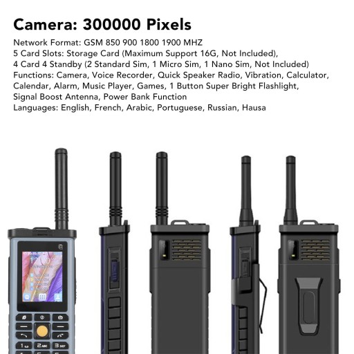 - Funkcje: Kamera, Dyktafon, Radio z szybkim gośnikiem, Wibracje, Kalkulator, Kalendarz, Alarm, Odtwarzacz muzyki, Gry, Super jasna latarka z 1 przyciskiem, Antena wzmacniająca sygna, Funkcja Power Bank