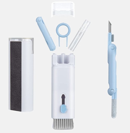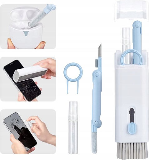 Narzędzie do czyszczenia 7 w 1 zapewnia niezrównane wrażenia z czyszczenia. Zestaw szczotek do czyszczenia zawiera 1 szczotkę o dużej gęstości, 1 ściągacz do klawiszy, 1 zginaną szczotkę do słuchawek (3 w 1), 1 ściereczkę do czyszczenia tylnego ekranu i 1 pustą butelkę z rozpylaczem płynu czyszczącego