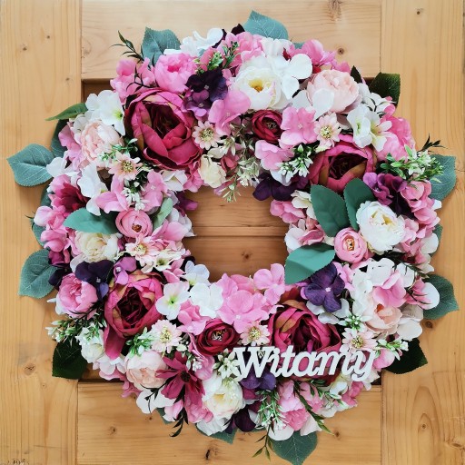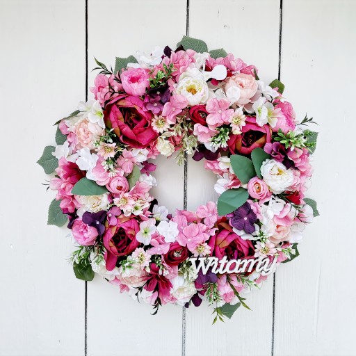 Wianek wiosenny letni ślubny powitalny na drzwi WITAMY 42cm delikatny kwiat