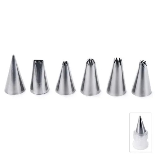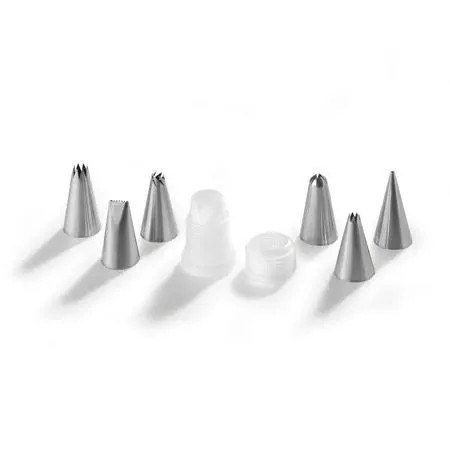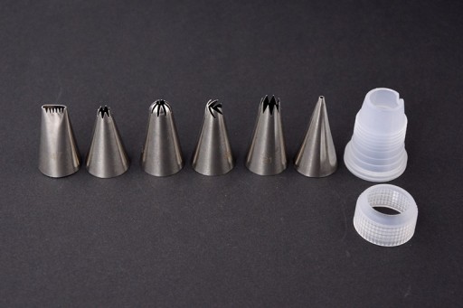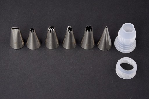 - W zestawie znajduje sześć różnych końcówek do dekorowania ze stali nierdzewnej oraz dwuczęściowy adapter z tworzywa.