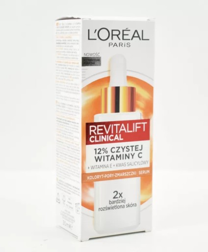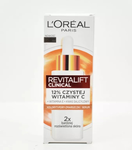 Revitalift Clinical Rozświetlające serum od LOral Paris, 30mlwzbogacone o 12% czystej witaminy C, witaminę E oraz kwas salicylowy, widocznie poprawia 3 kluczowe, pierwsze oznaki starzenia się skóry: