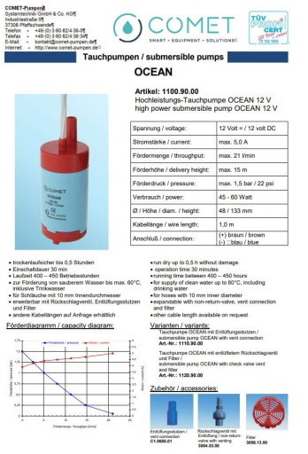Pompka zanurzeniowa niemieckiej marki Comet OCEAN nadają się do wszystkich przyczep kempingowych, kamperów, łodzi, jachtów oraz do użytku domowego, Jest to najmocniejsza i najbardziej wydajna pompka od producenta Comet,