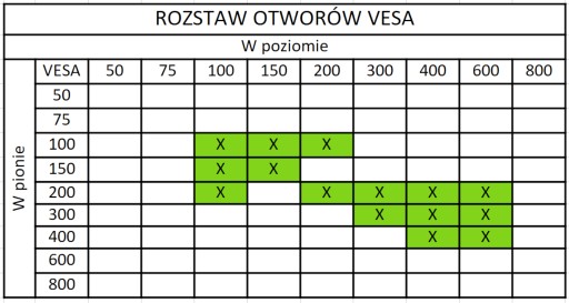 Zastosowany najbardziej popularny standard VESA sprawia, że możemy zainstalować praktycznie każdy telewizor wyposażony w otwory o rozstawie 100 x 100mm, 150 x 100mm, 100 x 150mm, 100 x 200mm, 200 x 100mm, 150 x 150mm, 200 x 200mm, 300 x 200mm, 400 x 200mm, 300 x 300mm, 400 x 300mm, 600 x 200mm, 400 x 400mm, 600 x 300mm, 600 x 400mm i wadze nie przekraczającej 40kg.