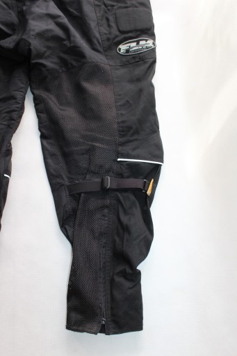 Letnie tekstylne spodnie, zapinane na zamek, haftkę i zatrzask, wewnątrz siatka przeciwpotna, w pasie po bokach rzepki do regulacji, zamek do dopięcia kurtki, 4 kieszonki, protektory biodra i kolana, element odblaskowy, u dołu nogawek zamek- używane stan dobry- widoczne ślady użytkowania- nadprute na szwie w kroku i na udzie, lekko przybrudzone- zdjęcia.