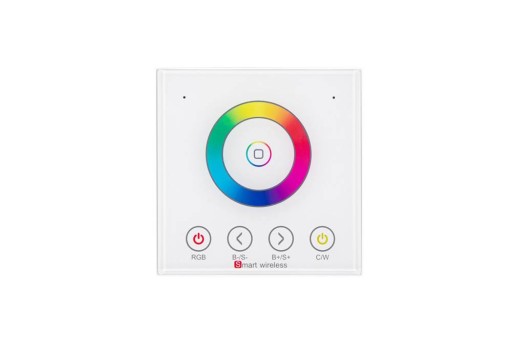 Kontroler o zasięgu do 30 m, z możliwością zarządzania temperaturą światła, barwą, jasnością i konfiguracją programów dynamicznych. Możliwość montażu w puszce lub naściennie, z dołączoną ramką.