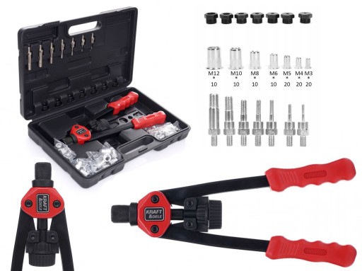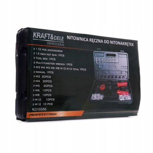 Profesjonalna nitownica ręczna model KD10556 polskiej marki KRAFT&DELE. Wykonana z najwyższej jakości materiałów, w tym stali oraz aluminium.