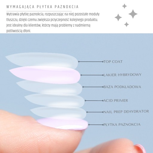 Primer kwasowy dedykowany jest dla osób z problematyczną płytką paznokcia, u której stylizacja nie utrzymuje się.