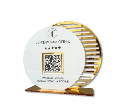 Tabliczka wykonana jest z akrylu (białego lub czarnego), oraz elementów lustrzanych złotych, srebrnych lub rosegold (różowozłotych). Kod QR, tekst oraz logo jest drukowane. Możemy na tabliczce umieścić Twoje logo lub nazwę Firmy.