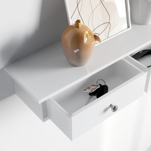 PÓŁKA ŚCIENNA Z SZUFLADAMI, BIAŁA to elegancka i funkcjonalna szafka, która doskonale wpasuje się w każde wnętrze. Dzięki neutralnemu białemu kolorowi produkt z łatwością dopasujesz do istniejącego wystroju.