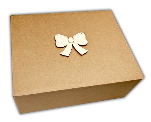Opakowanie - karton fasonowy wypełniony wełną drzewną z umieszczoną kokardą na wieku pudełka