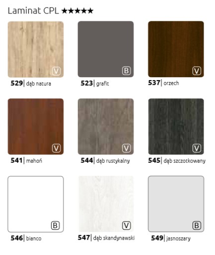 - Kolory orzech, mahoń, dąb rustykalny, dąb szczotkowany, bianco, dąb skandynawski, jasnoszary, grafit, dąb natura