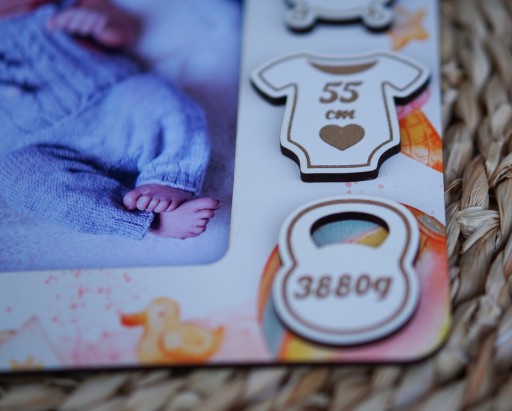 Metryczka dziecięca - kolorowa ramka na zdjęcie z elementami 3D. Pięknie ozdobiona kolorowym nadrukiem.