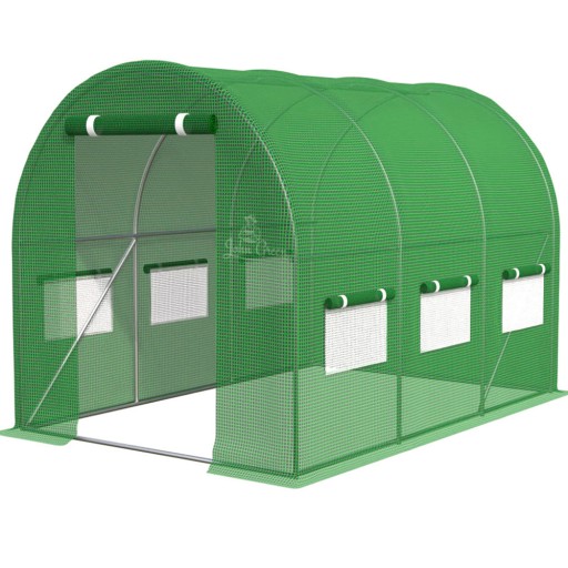 Folia na tunel ogrodowy wyposażona jest w okna z moskitierą. Dodatkowo posiada one zapinaną roletę, która pozwoli na ich zamknięcie. Zrolowaną roletę zapina się poprzez paski z zapięciem. Rozłożoną roletę można przypiąć do tunelu za pomocą zamka błyskawicznego.