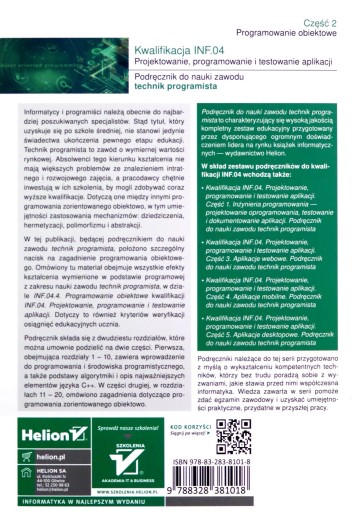 W tej publikacji, będącej podręcznikiem do nauki zawodu technik programista, położono szczególny nacisk na zagadnienie programowania obiektowego. Zakres omówionego tu materiału obejmuje wszystkie efekty kształcenia wymienione w podstawie programowej z zakresu nauki zawodu technik programista, w dziale INF.04.4. Programowanie obiektowe kwalifikacji INF.04. Projektowanie, programowanie i testowanie aplikacji. Dotyczy to również kryteriów weryfikacji osiągnięć edukacyjnych ucznia.