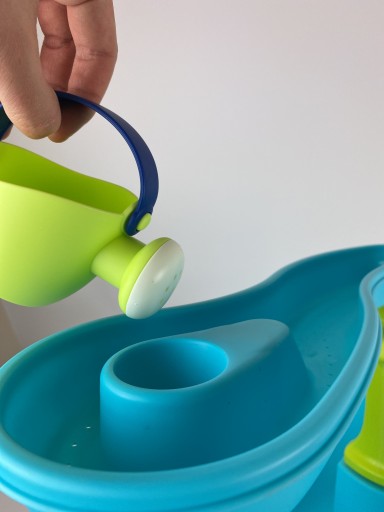 Nalanie wody do różnych elementów sprawi, że zaczną się poruszać i przelewać wodę do kolejnych poziomów stolika.