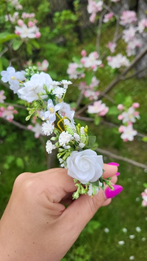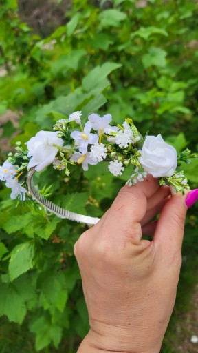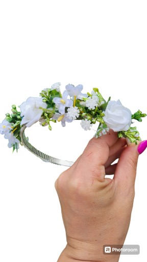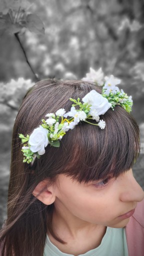 Opaska komunijna pięknie zdobiona kwiatami w kolorze bieli . To idealna ozdoba do włosów w kolorze bieli I zieleni . Może być wykorzystana na biały tydzień , lub na inne okazje niedzielę i święta.