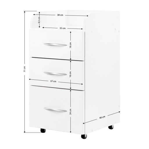 Szafka z 3 szufladami na prowadnicach rolkowych kolorze białym. Szafka ma zainstalowane kółka, co umożliwia łatwe przesuwanie jej po podłodze. Dane techniczne: - wymiary szafki 39 x 41 cm - wysokość szafki 70 cm - ciężar ~21 kg