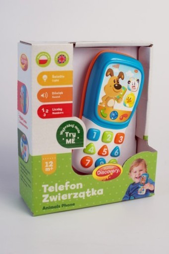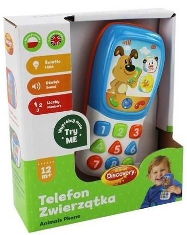 Edukacyjny, dwujęzyczny (polski/angielski) telefonik, dzięki któremu maluszek rozpocznie naukę cyfr oraz rozpoznawania kształtów. Kiedy dziecko naciśnie zieloną słuchawkę, usłyszy zabawną rozmowę zwierzątek, naciskając czerwoną, może ją zakończyć i zacząć zabawę od nowa. Dodatkową atrakcją są zabawne dźwięki, melodie oraz efekty świetlne pojawiające się na ekranie telefonu. Tego typu zabawka zagwarantuje dziecku naukę poprzez zabawę.