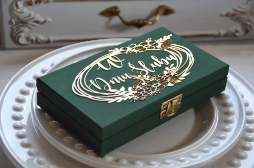 ✔️ wianek złoty naniesiony na wieku pudełka ze stałym napisem " W Dniu Ślubu" ,