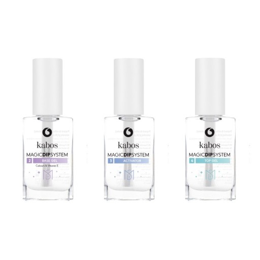 W zestawie znajdziesz trzy preparaty do Magic Dip Sysytem - Aktywator, Base Gel oraz Top Gel.