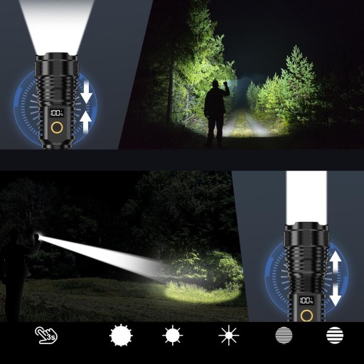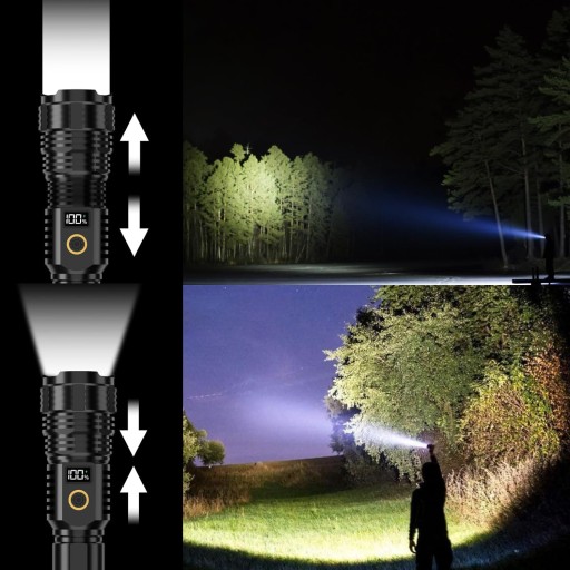 LATARKA, 10 0000 LUMENÓW, BARDZO JASNA, Z MOŻLIWOŚCIĄ ZOOMU, LATARKA TAKTYCZNA Z 5 TRYBAMI ŚWIECENIA, WODOSZCZELNOŚĆ IP65, LATARKA LED NA KEMPING, WĘDRÓWKI, DO AKTYWNOŚCI NA ŚWIEŻYM.