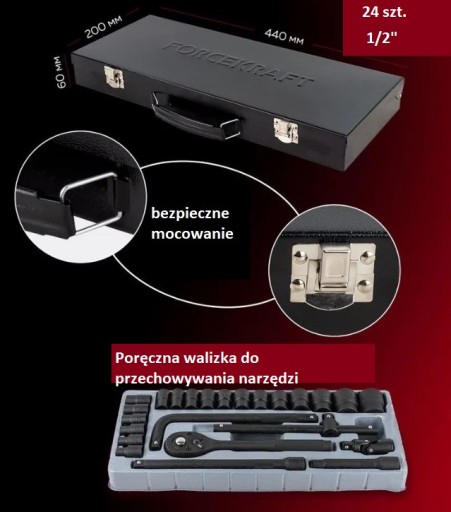Zestaw klucze nasadowe nasadki grzechotka 1/2" 8-32mm 24el firmy FORCEKRAFT.