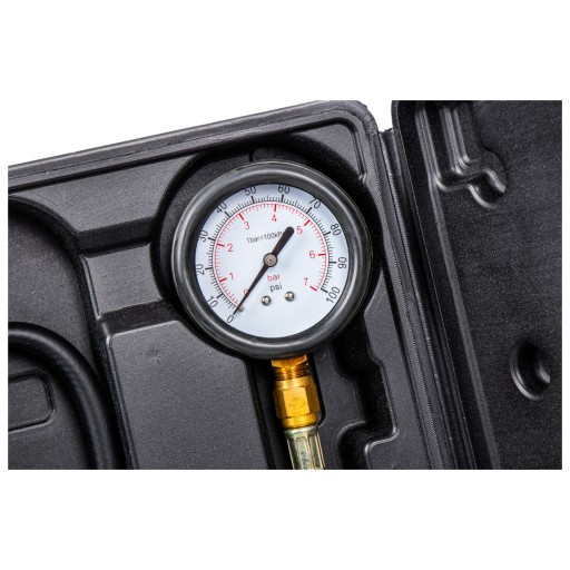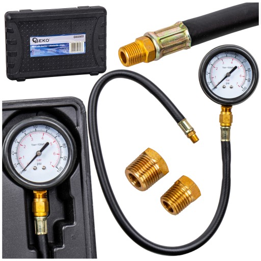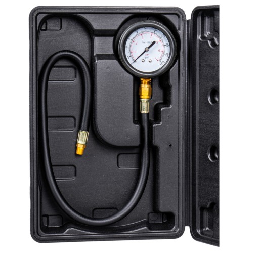 Jego wygodna konstrukcja obejmuje czytelny manometr o średnicy 75 mm, zabezpieczony gumową osłoną. Długi elastyczny wąż i 3 adaptery pomiarowe (1/8", 1/4", 3/8") zapewniają łatwość montażu i użytkowania.