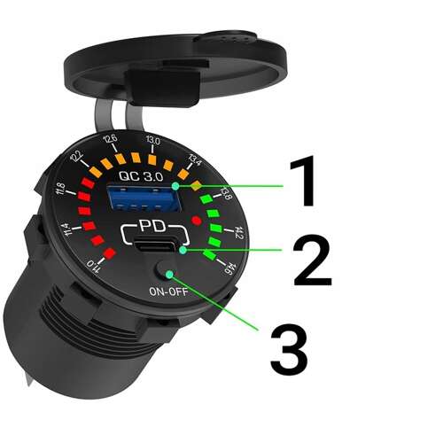 Ładowarka motocyklowa 2x QC3.0 + WOLTOMIERZ + przycisk: