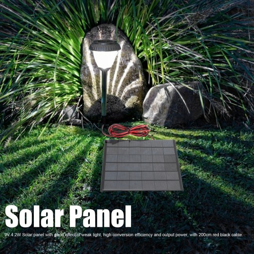 1. Panel słoneczny 9 V 4,2 W z dobrym efektem słabego światła, wysoką wydajnością konwersji i mocą wyjściową, z czerwono-czarnym kablem o długości 200 cm.