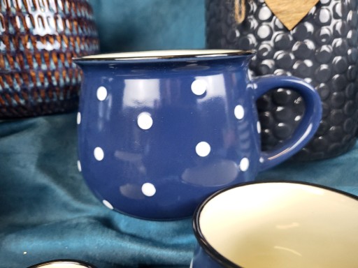 kubek w kolorze granatowym w kropki wykonany z ceramiki.