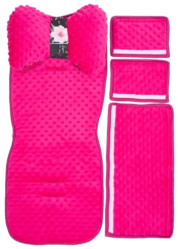 Dwustronna wkładka do wózka spacerowego wykonana z BAWEŁNY 100% w różnych wzorach i kolorach, z drugiej strony połączona z tkaniną MINKY Z BĄBELKAMI. W środku wypełniona mięciutkim ocieplaczem, można używać ją obustronnie.