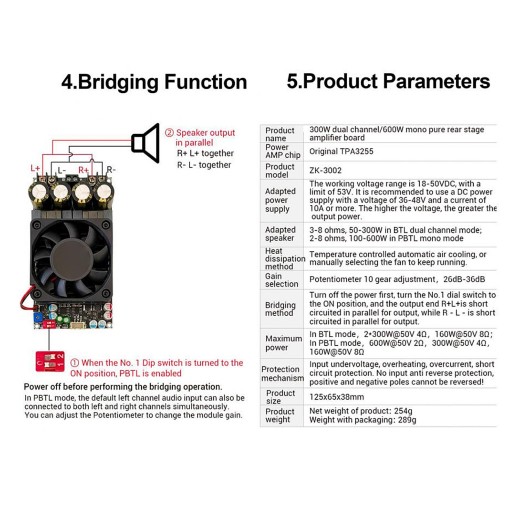 1. Ukad TPA3255: Wyposażony w zaawansowany ukad TPA3255, nasz wzmacniacz wykorzystuje najnowocześniejszą technologię cyfrowego przetwarzania dźwięku, zapewniając wyjątkowe wrażenia dźwiękowe. Jego wydajna konwersja mocy pozwala na dwukanaową moc wyjściową 300 300 W i solidną jednokanaową moc wyjściową 600 W, zapewniając mocny i czysty dźwięk.
