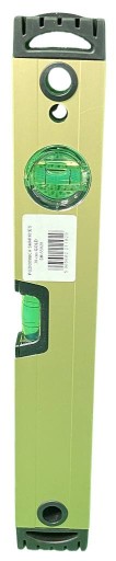 Poziomnica malowana złota. Materiał: Aluminium malowane proszkowo w kolorze złotym, ciężar: 540g/m\n, dokładność: 0,4 mm/m. Klejone obudowy libelki pionu i poziomu tworzące monolit z profilem aluminiowym co zapewnia długotrwałą dokładność pomiaru. Poziomnice wykonane z profili aluminiowych. Zakończenia z tworzywa wysokoudarowego. Libelle akrylowe.