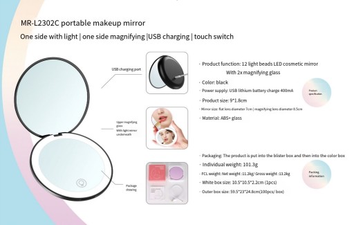 Компактное зеркало для макияжа с 2-кратным увеличением и светодиодной подсветкой.