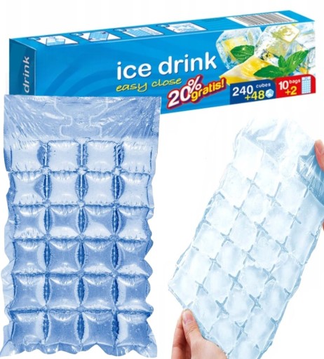 DUŻY ZESTAW aż 12 woreczków (10 + 2 gratis) zapewni 288 kostek lodu do ożeźwiających drinków i napojów.