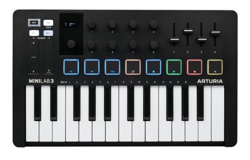 MiniLab 3 to kontroler MIDI typu plug-and-play nowej generacji, który łączy w sobie świetną, ekspresyjną mini klawiaturę, dynamiczne pady, fadery i encodery oraz pakiet oprogramowania klasy premium z bezproblemową integracją z DAW, który pozwala na pełną kreatywność od razu po wyjęciu z pudełka. Wersja: Black