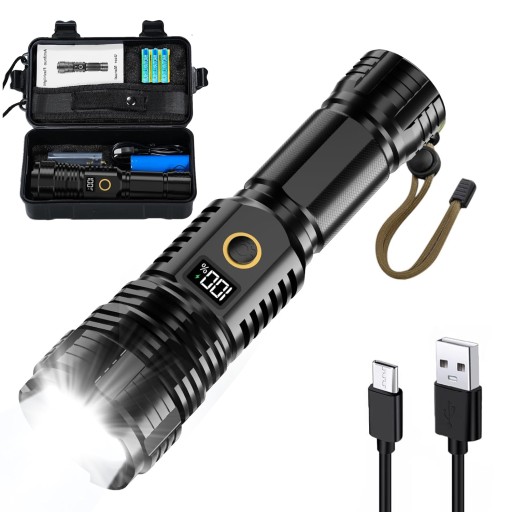 - 🔦【Wyświetlacz LCD i funkcja szybkiego ładowania】 Nowy wyświetlacz LCD pokazuje stan baterii (0% -100%) w czasie rzeczywistym, a latarka została całkowicie przeprojektowana, aby skrócić czas ładowania i wydłużyć żywotność. Ciesz się nawet 12 godzinami stałej jasności w trybie niskim. Dzięki wbudowanemu portowi USB ładowanie jest wygodniejsze niż kiedykolwiek. Może również służyć jako awaryjny power bank dla Twoich urządzeń mobilnych.