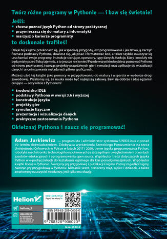 Możesz użyć tej książki jako pomocy w przygotowaniu do matury i wsparcia w wyborze drogi zawodowej. Przekonaj się, że nauka może być najlepszą zabawą. Baw się dobrze i zdaj egzamin celująco - oczywiście z Pythonem!