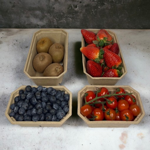 Pojemnik P500 Max z pulpy papierowej idealny do przechowywania owoców miękkich takich jak: maliny, truskawki, borówki itp. Solidna konstrukcja pojemnika zapewnia doskonałą ochronę owoców przed uszkodzeniami i utratą świeżości.