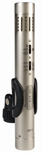 Sontronics STC-1 - Mikrofon pojemnościowy typu paluszek z wymienną kapsułą Sontronics STC-1 to mikrofon pojemnościowy z małą membraną, który nadaje się idealnie do nagrywania instrumentów wszelkiej maści - gitary akustyczne, flety, trąbki, skrzypce, czy różne perkusjonalia. Mikrofon posiada wbudowany pad (0, -10, -20dB) i filtr (0, 75, 150Hz), dzięki czemu jest to jeden z najbardziej elastycznych mikrofonów w swojej klasie na świecie i daje naprawdę imponujące, studyjnej jakości brzmienie za przystępną cenę, gdzie inne mikrofony o takich możliwościach kosztują znacznie więcej. STC-1 sprawdza się także świetnie jako overhead, czy ambient, zwłaszcza gdy połączy się go ze specjalnie zaprojektowaną kapsułą OMNI. Może zostać także wykorzystywany do nagrań stereo i producent w tym celu przygotował specjalny zestaw stereofoniczny STC-1S wraz z poprzeczką stereofoniczną. Mikrofon jest dostępny w złotym, czarnym i srebrnym wykończeniu. Dostarczany jest z uchwytem i osłoną przeciwwietrzną w stylowym drewnianym pudełku i z dożywotnią gwarancją. STC-1 domyślnie jest wyposażony w kardioidalną kapsułę, która może być wymieniana na kapsułę OMNI lub HYPER, dzięki czemu tak naprawdę z jednego mikrofonu robią się trzy! Wraz z kapsułą OMNI, STC-1 staje się świetnym mikrofonem do overheadów czy ambientu, natomiast dzięki kapsule HYPER, mikrofon jest bardziej skupiony na danym zakresie i sprawdzi się świetnie do hi-hatów, gitar akustycznych i innych instrumentów. Trochę danych Charakterystyka: Kardioidalna (opcjonalne kapsuły OMNI and HYPER capsules); Odpowiedź częstotliwościowa: 25 Hz - 20 kHz; Czułość: 12mV/Pa -36dB ±2dB (0dB = 1V/Pa @ 1,000Hz); Impedancja: ≤200 Ohm; Poziom szumów: 16dB (A-ważone); Max SPL: 137dB (0.5% THD @ 1kHz); Zasilanie: 48V ±4V phantom; Złącze: 3-pinowy XLR; Wymiary: 162 x 24 x 24mm; Waga: 214g; W zestawie z: uchwyt mikrofonowy, osłona przeciwwietrzna.