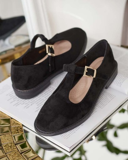 Damskie półbuty na płaskiej podeszwie. Cholewka wykonana ze skóry ekologicznej zamszowej, zaś wkładka wykonane ze skóry ekologicznej. Zapinane na sprzączkę. Idealne na co dzień!