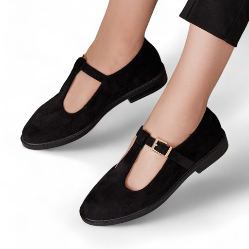 Damskie półbuty na płaskiej podeszwie. Cholewka wykonana ze skóry ekologicznej zamszowej, zaś wkładka wykonane ze skóry ekologicznej. Zapinane na sprzączkę. Idealne na co dzień!